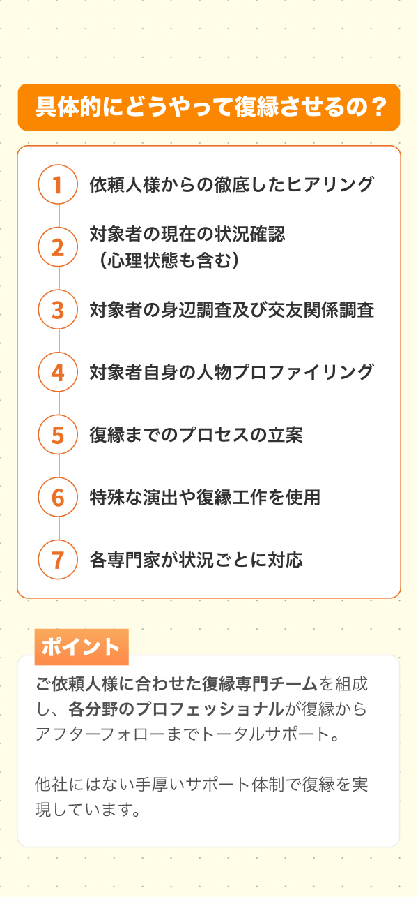 復縁のための調査や各種のカスタマイズ対応、ご相談者へのアドバイスなどを実施していきます。