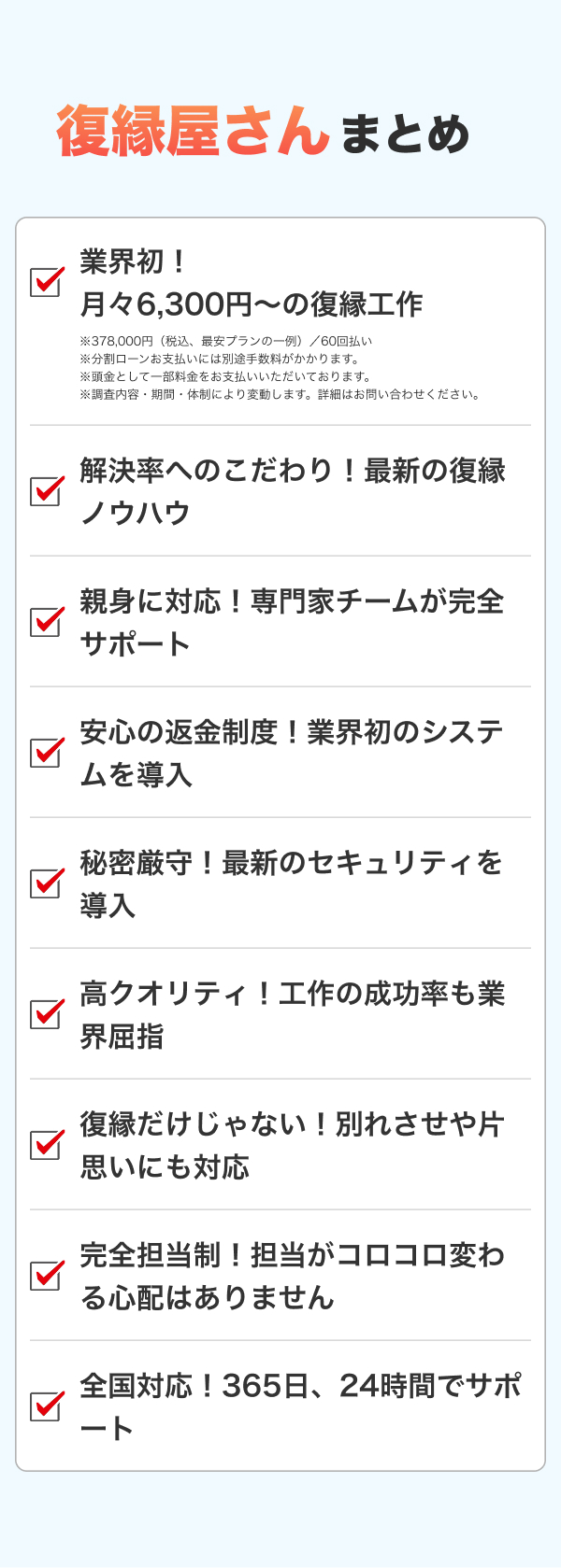ご契約や料金について不明確な部分や心配事があれば、無料復縁相談窓口や復縁担当者にお問い合わせください。弊社は透明性を重視し、お客様に安心してサービスを利用していただけるよう努めています。